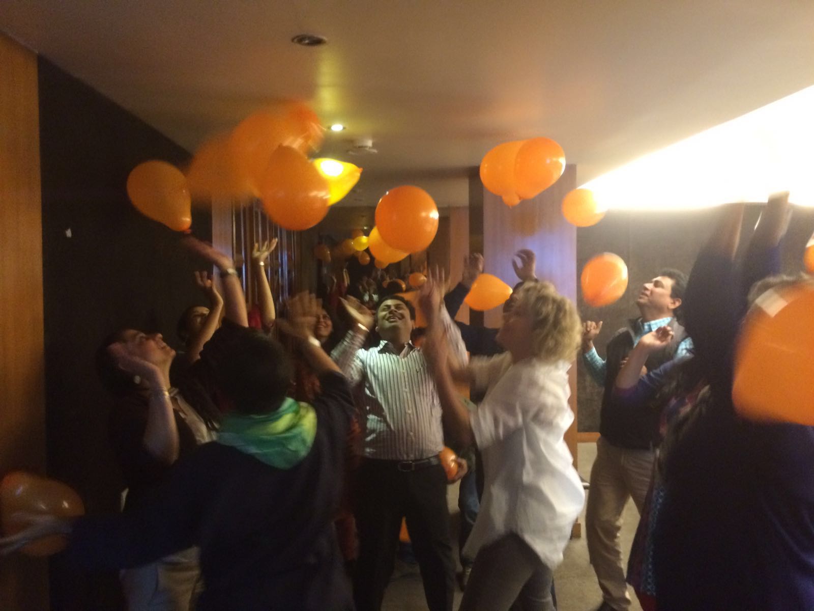Funny energizers brought fun in the group. Like a puzzle with a missing piece. The goal was to get cooperation and communication between the groups to reach a win-win situation. Also in sales you can only be successful if you cooperate with other departments and people to close and win the deal. And we did a funny energizer with orange balloons.