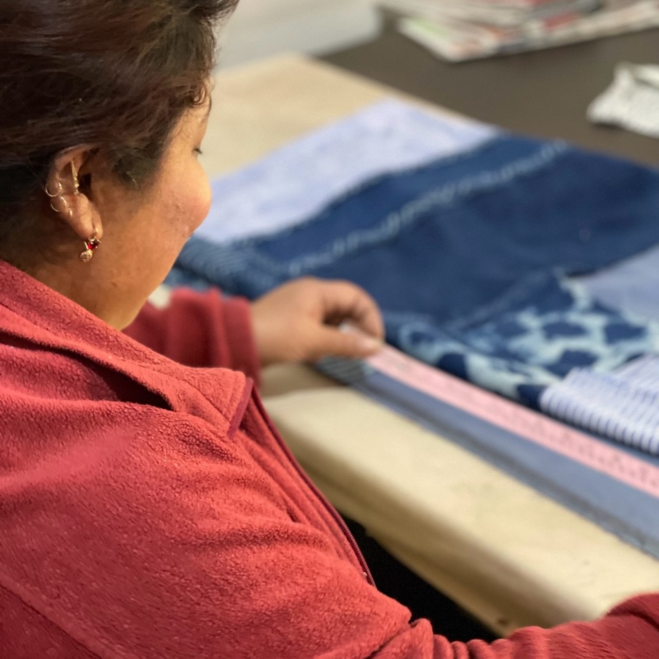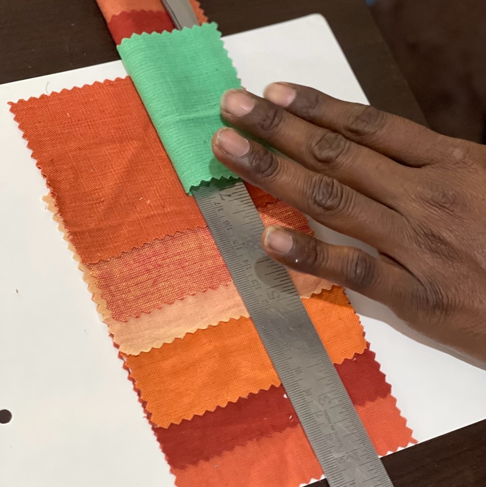 MORALFIBRE’s founder Shailini Seth Amin is an architect who turned social entrepreneur. In her own designed bungalow, just outside Ahmedabad, she has a beautiful studio where she creates and sells mainly clothing, but also smaller accessories like jewelry and bags, and stuffed animals. She and her team are always looking for new ways to process fabrics. Before I met the team, I wondered how we could share inspiration. Probably I could add my expertise of color schemes. Especially if items also find their way to Europe and America, because not every color scheme works for every region. That is why our two-day workshop started by staring at those cupboards full of fabrics. Large patches, small pieces, fine designs, woven stripes, block prints and multicolor fabrics, really the entire color circle was available.